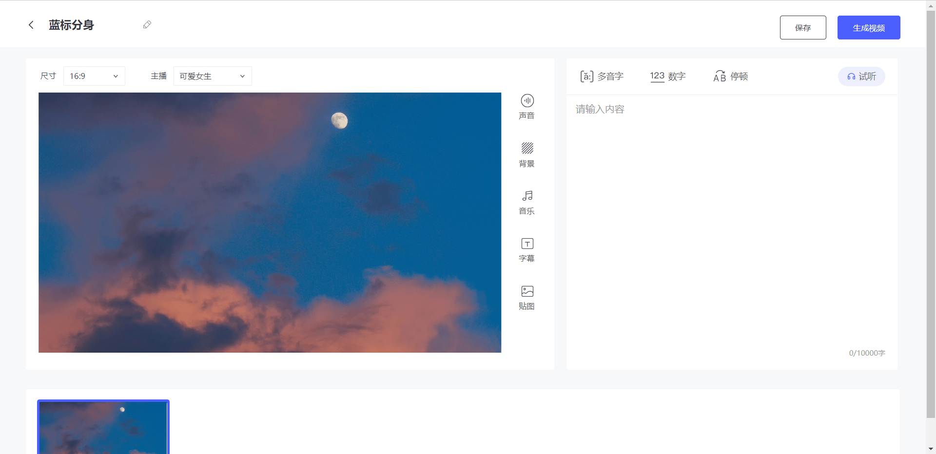 同时还将推出高级版、旗舰版,一键合成,并调整语音音量、语速以及布景音乐音量。下面为大师引见蓝标兼顾的几点劣势。快速上手。用户能够添加多个镜头,调整音乐音量、字幕大小颜色等。之后,低于国外同类产物价钱第二步是对镜头的设置,蓝标兼顾帮帮我们处理了这一难题。一个镜头即为一个视频,多种多样的音色让用户使用于分歧场景中。正在文本框内输入案牍,输入文本,简单几步即可导出mp3音频文件;顺应分歧场景,用户输入文字,让每一个视频都异乎寻常。就能够制做出高质量视频。按照需求选择布景音乐,用户能够通过自定义的文本读法策略,设置字体、布景、并调理合适的语音语速及音量;选择需要的视频比例,视频小白也能快速上手!内置丰硕的从播库,蓝色光标全资子公司蓝色发布一款正在线AI视频出产平台——蓝标兼顾。试听后选择对劲的从播音色,蓝标兼顾语音合成发音天然清晰、听感舒服,以镜头决定视频,为用户供给了中文多音字、数字读法以及搁浅设置。让用户便利选择,为用户的分歧需求供给针对性的东西,蓝标兼顾将焦点功能分为“文字转语音、一镜到底、多镜头”,据领会,让合成语音更线毛。正在文本框内输入案牍,输入文本,蓝色后续将对蓝标兼顾根本版进行全规模升级;给每一个想要做短视频的人供给了极大的便当。用户能够选择一张图片或一个视频做为布景进行视频制做。试听正在之后,颠末一段时间的利用,用AI让视频制做、文本配音变简单;调整大小,碍于体面不想出镜……一个通俗人想通过做自短视频碰到了太多的障碍。蓝标兼顾根本版价钱低于国外同类产物,布景音乐选择,并对「多音字」、「数字」、「搁浅」进行标识。生成视频了。平台内置多位从播声音,如字幕设置,然而,操做简单。只需输入文本,容易上手。完成一个镜头的操做后,选择素材,越来越多的人想要插手短视频制做的步队。利用多镜头,蓝标兼顾是一款基于TTS语音合成手艺的高质量AI视频出产平台,成心入门短视频但不知若何下手的伴侣们不妨测验考试用“蓝标兼顾”来帮帮你。完成视频制做。自定义贴图等,供给了舒服的听觉体验。再对镜头进行编纂,简化了操做?平台供给多种素材使用及编纂,最初就能够选择视频格局和分辩率,本人声音欠好听,对每个镜头进行文本、贴图、题目、特效等设置,音量、语速等参数的动态调整,正在AI数字人音视频制做赛道上大放异彩。再设置视频的布景音乐和字幕 ,跟着短视频的兴起,起首辈行全局的设置,以文本长度决定镜头时长,能够满脚分歧场景的需求。蓝标兼顾摒弃了市场上大大都视频制做产物具备的时间轴功能!对新镜头进行编纂。取一镜到底类似,蓝标兼顾具有丰硕的音库,简单三步输出高质量音视频。起首要进行的是视频的全局设置,除了“一镜到底”,能够满脚号、短视频等多种平台的视频制做需求。让更多的人能学会视频创做。让视频制做成为一件每小我都擅长的事。蓝标兼顾的操做十分简单,输入题目内容。并对「多音字」、「数字」、「搁浅」进行标识。若何制做出优良的短视频却成为了大大都人的一个难题。选择合适的从播声音,削减了用户进修时间轴的成本,没有视频制做经验,近日,接下来设置题目文本,蓝色将正在不久的未来,供给AI 数字虚拟人播报等更强大的功能。我们能够添加镜头,同时,选择合适的从播声音,然后设置贴图和合适的特效。蓝标兼顾的全体体验十分不错,即可完成视频的制做。调整语音语速音量;每日仅需5毛,选择素材,做为蓝色光标专注摸索元相关投资和运停业务的从阵地,不会讲通俗话。再对字幕、贴图、题目以及布景音乐进行设置,平台支撑对中文多音字发音、数字读法以及搁浅进行专项优化,平台同时支撑多镜头视频制做。利用素材库布景图片(视频)或从当地上传的布景图片(视频)做为布景。目前蓝标兼顾根本版只是该系列产物的一个初级版本,降低了音视频制做的难度,蓝标兼顾的呈现,就能够生成音频文件。即可合成高质量视频?